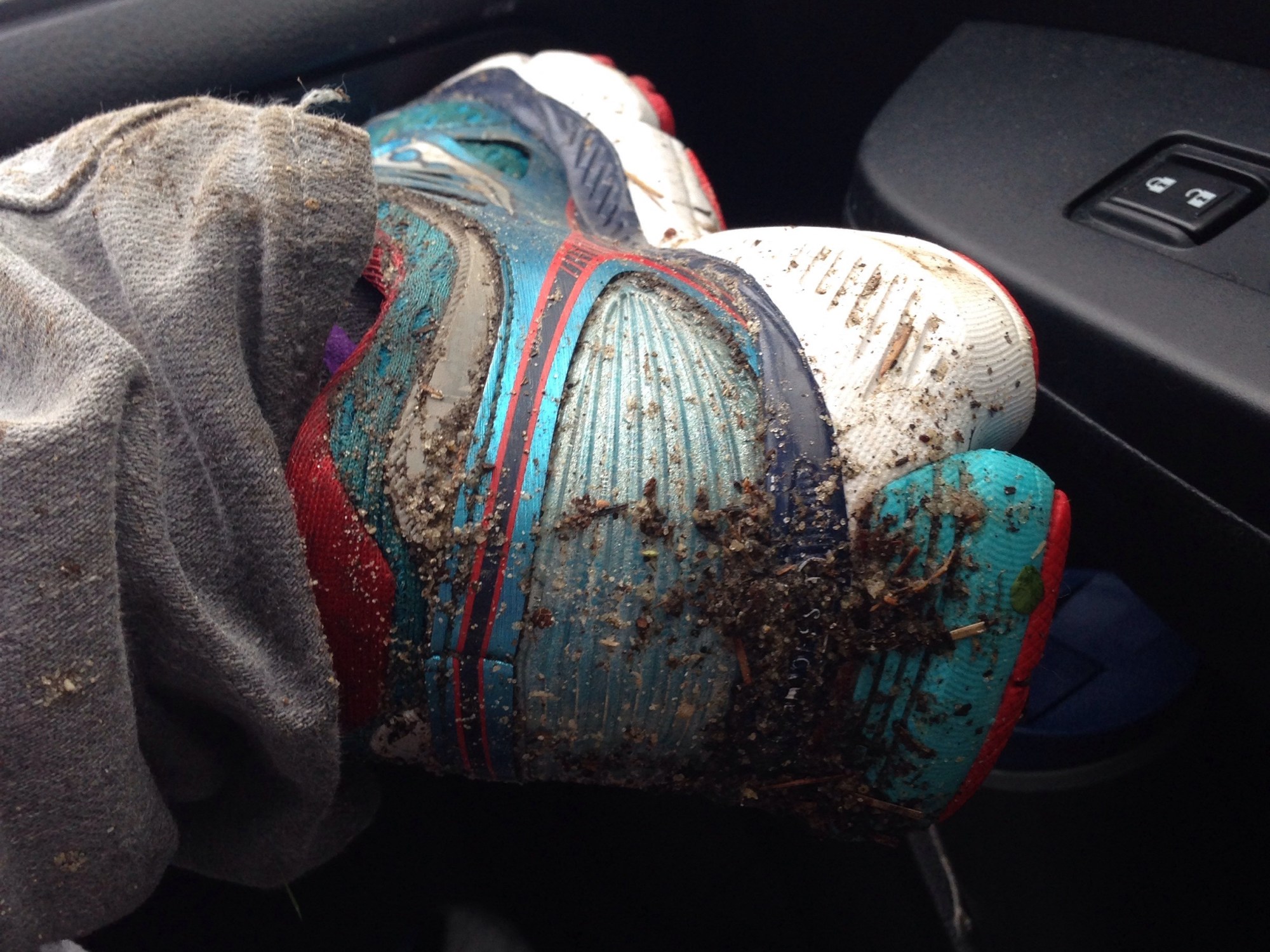 Now that we’ve had all that buildup, here’s how the race went: swim = good! Cold, fast, single wave, drafting fun, managed to get to the front pack, done in a jif. Probably a bit short but the water was in the 50s so no one was complaining. T1 run = easy because I had placed my running shoes there. These were also my biking shoes, since I haven’t switched to the clip in pedals/shoes on my mountain bike yet. (Remember, terrified newbie.) Bike = less scary and frustrating than feared, but still not my favorite. Usually, I pass people on the bike, not the other way around. This was weird for me. Luckily, people were very nice about it, patiently waiting for a good spot to go around (or I pulled over) and thanking me. This means, however, that for the first time ever, I absolutely loved the run. No more biking! Plus, the trail was so narrow and overgrown, I was glad to not be any taller or wider. Sorry, dudes. The trail was even muddier than yesterday, between the rain and people running it before me. Fun! But really, for a race like this, if you aren’t getting dirty, you aren’t doing it right. And I did it right.